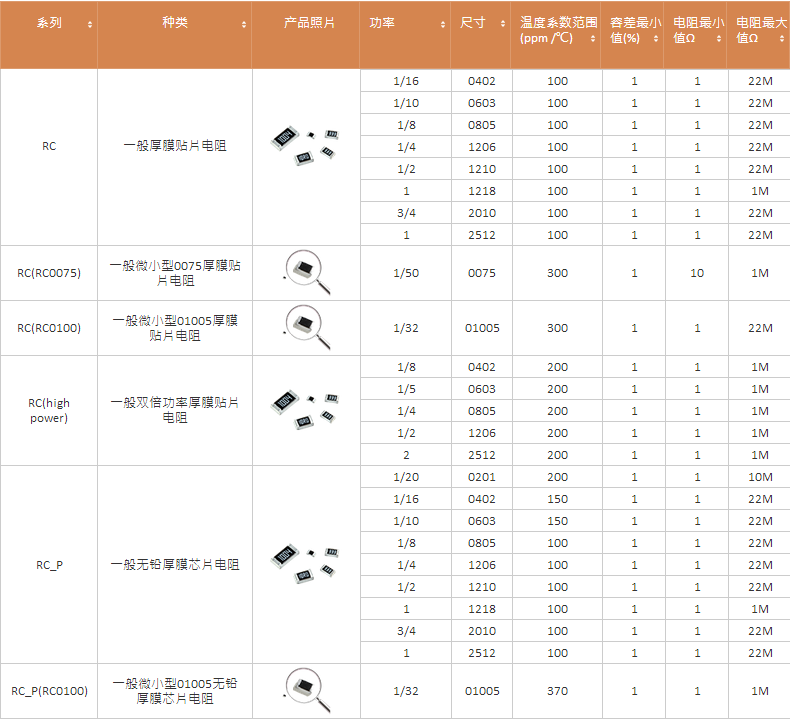 國巨RC系列厚膜電阻包括了:常規厚膜電阻、小型0075厚膜貼片電阻、小型01005厚膜貼片電阻、大功率厚膜貼片電阻、無鉛厚膜貼片電阻。